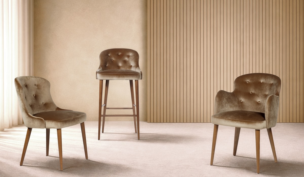 The TAYLOR collection consists of a side chair, armchair and barstool, with a contemporary and clean line combining rounded shapely back also available with button upholstery.