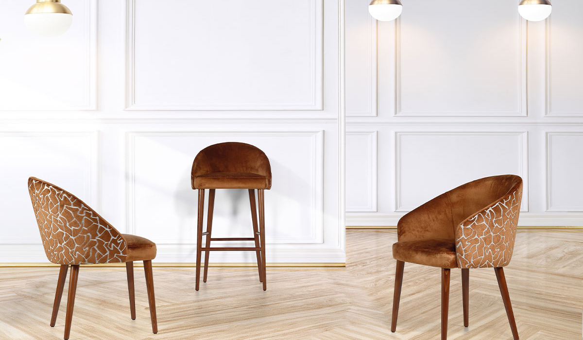 La gamma comprende sedie, poltrone e sgabelli, completamente personalizzabili con un'ampia gamma di finiture e tessuti per integrarsi perfettamente al vostro arredamento.